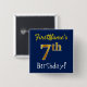 Den här enkla fyrkantiga knappdesignen innehåller ett meddelande som "FirstName's 7:e Birthday!", där "7:e" har ett utseende som påminner om guld och utseende på en blå färgad. Namn kan anpassas. Knappar som dessa kan kanske bäras av gäster i en födelsedagsfest till någon som firar sin sjunde födelsedag, där party hålls i ett stort område med många andra närvarande personer (t.ex. en stadspark eller en temapark). [~Z0000164]