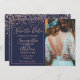 Ro konetti marinblått spara datumfotona med typsnitt av elegant, faux ro guld foil konetti och geometric ram på en redigerbar marin blå bakgrund.