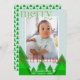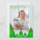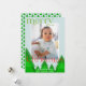 Ett helt nytt julkort med ett enda foto inramat i ett vitt gräns på en blek isblå bakgrund. En skog med geometriskt träd med skuggor av grönt ger en unik detalj. En ljus grönt och röd "god jul" i ett formbart teckensnitt med några fräcka blomningsfärger. Anpassa med ett kort budskap och namn och året. Kortets baksida har ett träd mönster i ett matchande färg-system.