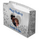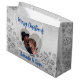 Faux silver bakgrund. Dekorerad med snöflingor. Anpassa och lägg till ditt/dina namn. Hjärtformade foto ram. Blå text.