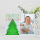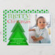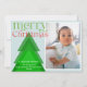Ett helt nytt julkort med ett enda foto inramat i ett vitt gräns på en blek isblå bakgrund. Ett enkelt geometriskt Julgran med skuggor av grönt ger en unik detalj. En ljus grönt och röd "god jul" i ett formbart teckensnitt med några fräcka blomningsfärger. Anpassa med ett kort budskap och namn och året. Kortets baksida har ett träd mönster i ett matchande färg-system.