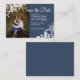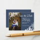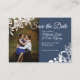 Vit blommönster ramar, spara ditt foto på det blå gråttet datumkortet. Den enkla utformningen av bröllop är mångsidig för årsdagar och födelsedagar och är ett vackert sätt att tillkännage datumet i bröllop. Dekorativ fotodesign i gräns kan överföras till andra produkter. Unik teckning lägger på ett vackert sätt över förlovningens foto.