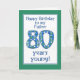 Ett 80-dagars snyggt kort för ett Far, med nummer 80 tillverkat av en handmålad papper kollage, i blått, grönt och vitt, som samordnar med bokstäverna och kortets gräns. Glöm inte att du enkelt kan anpassa insidan av detta 80:e födelsedagskort.