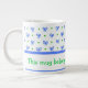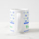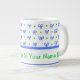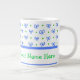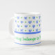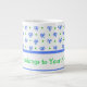 En söt Jumbo-storlek kaffe mugg eller sopplung som ska anpassas, med en mönster av bögar och prickar i blått och grönt på vit bakgrund från en handmålad design av Judy Adamson. Samordning av tekruka och pitcher finns också.