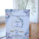 En lyxig design med delikata blå och guld vattenfärgade blommor, som blandar elegans med konstnärlig charm. Paletten rik färg skapar en romantisk, sofistikerad estetisk perfekt för en förfinad bröllopsinbjudan.