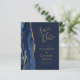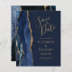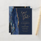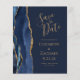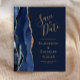 Det moderna bröllop spara datum-kortet från elegantens lämnat kant har ett marint blåfärgat agat gräns som trimmas med faux guld glitter. Anpassadet kombinerar handskrift, rityta och kursivt typsnitt med guld-färgad på en marin blå bakgrund. Den omvända sidan har en matchande marin blå och guld-agate-design.