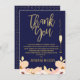 Denna bröllopsdusch tack-kort har text i faux-guld kalligrafi samt ett högt elegant champagneglas på en marinblå bakgrund. Designen inkluderar även ett delvis akvarell blomsterarrangemang vid basen av designen. Baksidan av inbjudan är också marinblå med ett slumpmässigt faux-guld prickmönster. Samma design för bröllopsdusch inbjudningskort finns tillgänglig i butiken. Detta tack-kort för bröllopsdusch är redo att anpassas.