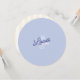 En förfinad rund bröllopsmeny och platskort med en mjuk dammig blå palett i par med elegant skript typografi och känsliga illustrativa detaljer. Det rena cirkulära formatet skapar en modern, redaktionell look samtidigt som det tillför en subtil utsmyckning till ditt dukning.