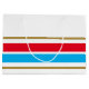 Den här roligten har en sportig design med extra-täckande ljusröd färg och himlar blå grund kant twin tävla rand, som är åtskild med varmt brunt streck mot en vit bakgrund.