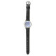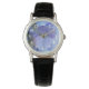Fint, elegant blå vattenblommor smakar den här klockan. Stängningsvy för petaler och blomdetaljer. En vacker klocka i tidlös bra smak. Vit numrering på titta på ansikte. Läderband.