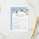 Vem vet bruden bäst? Blått spelkort för möhippa av blommigt med vattenfärgade illustrationer av blåa vattenområden, vit ros, rosa ros och grönska. Anpassa genom att lägga till namn, händelse och datum. Det här blommigten är ett brickkort för perfekt för möhippor och bröllopsfester.