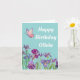 Iris Pumila-blommans vattenfärgsfärgkort namn födelsekort med ljusblå bakgrund