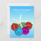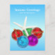 Blått tropiskt julvykort med stjärnfisk och prydnadsföremål. All text är enkel att anpassa för alla Julhälsningar. Baksidan är för enkelhetens skull riktad.