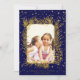 Guld gräs ram med foto och guld konetti marint blått julkort. En underbar design som innehåller en guld gräs ram med kon och nål, guld konetti gräns och ditt foto på blå bakgrund. Baksidan är täckt av en konfekt från guld. Ändra bild och text så att de passar dina behov.