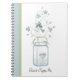 Elegant anteckningsbok som göras i en chic stil för stuga, med en vintageillustration av delikat blåttklockor i en masonburk. Ett ljust - blått- och gröntmusikbandet dekorerar vänster sida, av anteckningsboken. Parets initialer är på masonburken, och extra text som är längst ner, är klar att personifiera för din stora dag. Den underbara gästen undertecknar i boken för ditt bröllopceremoni och mottagande.