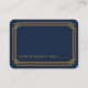 De här platskorten har en blå palett och guld färg, ett geometriskt ram och andra stilistiska detaljer som alla inspireras av Art Deco och de nära 20-talen. Du kan anpassa exempeltexten till fält.