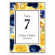 Detta kort för bordsnummer i bröllop har en gräns av vattenfärgade blommor och löv i marint blått och gult guld, med beröring av ljusblått och grönt. Din anpassningsbar är mörk blått i mitten av fyra fält. Kortets baksida är identisk med framsidan. *Den här designen användor teckningar från LABF-skapelser.