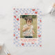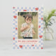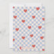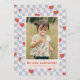 Ett kort för alla hjärtans dag med röda hjärtan utspridd över en ljusblå schackbräda. Meddelandet och kundinformationen placeras under ett stort foto och kortets baksida har ett samordnande mönster.