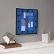Detta mönster skapas i stilen som är som påminner om av Piet Mondrian. Blått formar, kvadrerar, och rektanglar som skisseras i en ultramarine blått, gränsar. Varierande skuggar av blått inkluderar himmelblått, slösar grått, och verditerblått. Denna abstrakt design fokuserar bildar, formar och färgar på för att frammana en emotionell reaktion, som talar till vår intuition, erfar och undermedvetet.