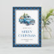 Blåbuffelplatta God jul-kort med blå återtro lastbil. Anpassa det här snökortet enkelt till din familj namn och året om... helgdag..