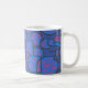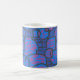En snyggt vit kaffe mugg med elblått och magenta abstrakt mönster, från en silkesskärmskrift av Judy Adamson.