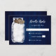 Blåkort för flotta med en mason burk och två burlap-hjärtan med initialer mot en rustisk träbakgrund. Anpassa enkelt den här söta onlinen av marinblått OSA kort.