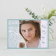 Detta meddelande om en studentfest med en blått teal paisley fem gånger i trendiget kan användas till inbjudan familj och vänner till ceremonin i studenten eller till ett party för att fira studenten. På framsidan finns det en blå tealpaisley-design på den lämnat sidan och studenten på högerna. I mitten kan du enkelt lägga till ett foto. På baksidan kan du enkelt anpassa informationen om ceremonin/party. Grafik efter streckad Daisy Utformning på MyGrafico