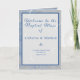 Design innehåller texten i det traditionella katolska Nuptial Mass-formatet som visas mot ett blått och grått-marmor. Den katolska symbolen IHS med kor visas på framsidan. Bakgrunden har en marmoreffekt. Utrymme för upp till sju brudtärnor och Marskalkar. Baksidan innehåller anpassadets tacksamhetsbudskap och ett valfritt minnesmärke för de nära och kära som har passerat. Innehåller även utrymme för fotot. All text är anpassade. Designad för samordning med "Blue & Grått Marble Monogrammed Bröllop Suite".