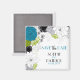 En feminin och romantisk illustration av olika blommor och löv. Det är mycket färgstarkt med svart, blå, grått och grönt färg perfekt för vår eller sommar bröllop.spara datum magneter har en matchande bröllopsinbjudan.