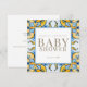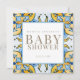 Blått och Gult, babyinbjudan. Fyrkantig. Guld text.