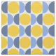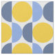 Den här feta väven har moderna geometriska cirklar och halvcirklar i ljusa skuggor av gult och blues.