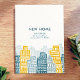 Staden Retro stil med gult och byggnad med blå tecknad för ett mycket exklusiv nytt adress tillkännagivande. Kontrollera matchningssamlingen för SAMORDNINGSARTIKLAR. ♥ Originalteckningar med PUPSIKU STUDIO. 100 % unika produkter.