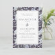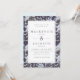 En inbjudan till söt och elegant bröllop med en blommönster med vattenfärgsbakgrund av blå vattenområden och löv på en mörk med skifferblå bakgrund/kolbakgrund, överlagd med en dubbla rektangel ram. Bröllop-detaljer finns i kapitlet "Sate blue charcol serif". Baksidan är i fast ljus/dammblått. Den här designen skulle fungera bra för ett vinterbröllop.