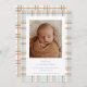 Lägg märke till att din lilla födelsemeddelande i pojke kommer, med en blå och orange plaid-design som är perfekt för fall! Det mysiga, säsong färg ge, känner sig varmt och välkommet, skapar det ett vackert sätt att era glädjande nyheter med familj och vänner. Detta tillkännagivande är ett snyggt och ett hjärtligt sätt att presentera ert senaste tillskott till världen, och det är ett fullständigt anpassade med baby och ett speciellt budskap. Perfekt för ett falltemafritt födelsemärke!
