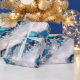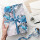 Elegant jul som slår in papper med glittery julprydnadar för härliga blått, sparkling ljus för vit, skins silverpärlor och glitter.