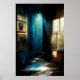 Det här är en målning av ett rum med sentimentala bilder på väggen och blå och guld tapestry som markeras med solljus som kommer genom fönstret. Inspinerad av Oscar Petersons återgivning av klassiska "Blue and Sentimental: by Count Basie. Fällande färgdrag kompletterar tonen i sång. Underbar poster för vilken källarjazz-klubb som helst. Kreativets presentidé för jazz eller blues älskare i ditt liv.