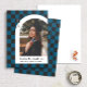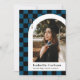 Detta moderna och unika tillkännagivande i studenten har en marin blå och svart bakgrund som belyser ett foto av student i en vit båge med student namn och i skolan under. Ett litet graderingshölje visas på ett smart sätt i den kontrollerade bakgrunden med student studenten. På baksidan finns en roligt som matchar mönster i mörkens turkos blue och black.