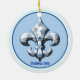 En keramisk fleur de lis julprydnad. På bekläda en kall blåttbakgrund, med en vit fleur de lis som strilas med snöflingor. På baksidaen planlägger samma, men vi tillfogade texten "JUL 2010". Du kan hålla den text eller ta den bort, ELLER du kan ändra den, genom att skriva i din egna text! Det är anpassadet ditåt. Gör en underbar helgdaggåva eller ser härligt på dina julgran- eller julpaket.