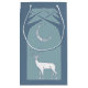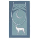 Ett original- Celtic fnurrastilkonstverk som visar en vithjort med stora utgreninghorn på kronhjort i en mjuk blåttskogsilhouette av vävde trädgrenar, och ovannämnt för måne för ljus vit som det växande dekoreras med oändliga fnurror på ett ljust - slösa färghimmel.