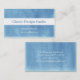 Föreställ din affär med dessa flott och chicpersonligvisitkortar. 100% personlig. Använd textmallen för att sätta in, och/eller att tillfoga any att uttrycka som är nödvändigt att sätta din namn och affär, avbilda på ditt egna personliga kort. En evig sanning som är nödvändig för att portion ska bära din affär, och namn till det nästa jämnar av yrkesmässighet. Kort presenterar ett ljust - blått och vit tvättad bakgrund för suedemönsterstruktur med ett djärvt vitrandspring till och med centrera. Kort är dubbelsidiga med en koordinerad tvättad färg för blåttstrukturbakgrund på baken.