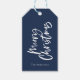 Blått och vitt skript god jul presentetikett