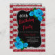 Elegant röd och silver rand glitter och blå ro födelsedagsfest inbjudan för kvinnor i alla åldrar. Åldern kan ändras för vilken ålder som helst. Text kan ändras till vad som helst för att passa din händelse. Typsnitt, typsnitt färg och text är helt anpassade! Papper form och typ kan anpassas efter din budget och smak!