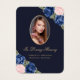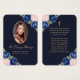 Vacker blått minneskort och guld-blommigt-/begravningskort med ett foto som är försett med rosa och blått ro och baby utandningsblommor på mörk blått bakgrund.
