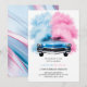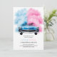 En mall för inbjudan till en biltemat Baby Gender-kalvningspartiet. Utformningen har en blå bil som kommer från ett moln av blått och rosa rök. Den vita typografiktexten är blå eller Rosa. Anpassa genom att redigera den digitala eller tryckta inbjudan med din händelseinformation.