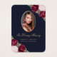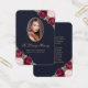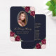 Vackblått minneskort och guld-blommigt-/begravningskort med ett foto som är försett med rosa och burgundblommor i röd ros och baby utandningsblommor på mörk blått bakgrund.
