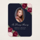 Vacker blått minneskort och silver-blommigt-/begravningskort med ett foto med rosa och burgundröd vattenfärg ro och baby utandningsblommor med mörk blått bakgrund.