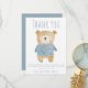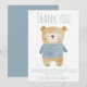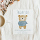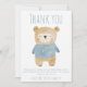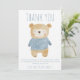 Jag vill uttrycka min tacksamhet med den här vackra babyduschen tack vare ett kort med en söt björnillustration med en mjuk blå tröja. Den minsta, pastellformade designen är perfekt för pojke och innehåller ett hjärtskärpt meddelande med text från namn i familjen. Idealisk för att ha skickat uppskattningar till dina gäster för deras tankeväckande gåvor och vänliga önskemål.