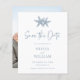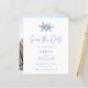 Det här moderna minsta strandtemat budgetkort för bröllop spara datum har en vit bakgrund med dammig blå text, två stjärnfiskar överst och trendig handskriftskript kalligrafi, med en fotomall på baksidan.