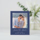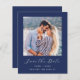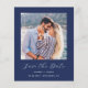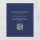Det här enkla, minimalistiska Spara datumkortet innehåller ett fyrkantigt foto ovanför orden "Spara datum" i ett vitt handskriftsskript i elegant, följt av parets namn, bröllop datum och stad i sans serif-teckensnitt på en marin blå bakgrund. Lägg till ett mer detaljerat meddelande med ytterligare information om motsatsen, tillsammans med en QR-kod som hjälper dina gäster att besöka webbplatsen för bröllop.