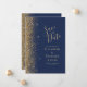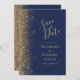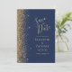 Det moderna bröllop spara datum-kortet från elegantens lämnat kant har ett guld faux glitter gräns. Anpassadet kombinerar handskrift, rityta och kursivt typsnitt i blek guld-färgad med en marin blå bakgrund. Den omvända sidan har en matchande marin blå och guld-design.